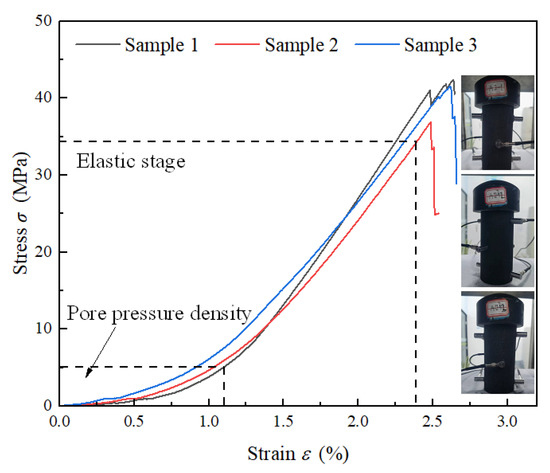 To ensure that the applied load in the percolation experiment leaves the specimen in the elastic phase without damage, it is ensured that the specimen is in the same state as the initial state before all levels of loading are applied. First, the stress–strain curves of standard cylindrical coal samples under uniaxial compression conditions were determined. This is illustrated in Figure 8. According to the stress–strain curves, there are two distinct phases when the experimentally selected coal sample is subjected to external loading, namely the pore compacting phase and the elastic phase. First, in the pore compaction stage, the pores inside the specimen and the matrix of the specimen are stressed to produce strain, but the stress changes are small. As the stress increases, it enters the elastic phase at approximately 5 MPa. During the elastic phase, the stress–strain curve of the coal sample varies linearly. The load values added for the percolation experiments were suitable for selection in this phase. The compressive strength σc of the coal sample selected for this experiment was calculated to be approximately 39.6 MPa. The slope of the curve within the elastic phase reveals that the coal sample is stiffer and less plastic, with more pronounced brittleness [21]. In combination with the above experimental results, the stress loading scheme can be determined, as shown in Table 2.