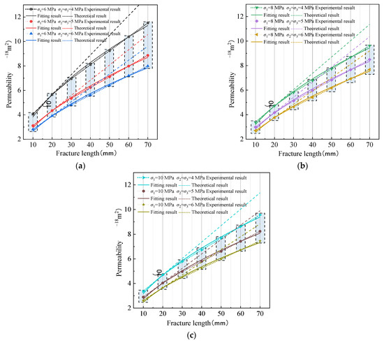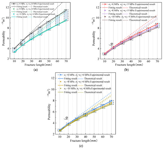 According to Figure 11, when the confining pressure σ2 = σ3 = 4 MPa, the axial pressure σ1 changes to 6, 8, and 10 MPa. With the increase in fracture length, the permeability of the coal samples changes by 4.04 × 10−18 to 1.11 × 10−17 m2, 3.38 × 10−18~9.57 × 10−18 m2, 3.36 × 10−18~9.51 × 10−18 m2, respectively, and the permeability change is approximately 1.8 times; When confining pressure σ2 = σ3 = 5 MPa, the axial pressure σ1 changes to 6 MPa, 8 MPa, and 10 MPa. With the increase in fracture length, the permeability of the coal sample changes from 3.11 × 10−18 to 8.39 × 10−18 m2, 2.99 × 10−18~8.11 × 10−18 m2, 2.89 × 10−18~7.97 × 10−18 m2, respectively, and the permeability change is approximately 1.7 times. When the confining pressure σ2 = σ3 = 6 MPa, the axial pressure σ1 changes to 6, 8, and 10 MPa. With the increase in fracture length, the permeability of the coal samples changed from 2.81 × 10−18 to 7.62 × 10−18 m2, 2.70 × 10−18~7.42 × 10−18 m2, 2.62 × 10−18~7.42 × 10−18 m2, respectively, and the permeability change was approximately 1.7 times. Further analysis leads to the following conclusions: changing the axial pressure σ1 when the surrounding pressures σ2 and σ3 are small, the overall change in permeability is more obvious; when the surrounding pressures σ2 and σ3 are large, changing the axial pressure σ1 weakens its effect on permeability. Under the same stress conditions, the seepage size effect of the coal samples is more obvious.