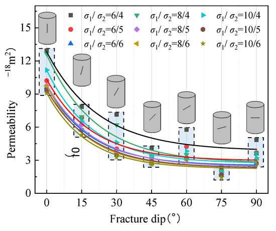 Researchers have now found that fractures in coal at different dip angles have a significant effect on the mechanical characteristics of the coal. Fractures with different inclination angles can reduce the strength of the coal and accelerate its change in the stressed state. It is now known that fracture seepage is influenced by the mechanical characteristics of the fractures in the coal. It is therefore important to investigate the effect of fractures of different inclination angles on the seepage characteristics of coal as well. To supplement the study of the size effect of the permeability of coal samples under different stress conditions and verify the effect of fracture inclination on permeability, experiments on the percolation of coal samples with different fracture inclinations are now being conducted. The experimental results are shown in Figure 13. Based on the experimental results, it can be seen that, under the assumption that the effect of differences between different blocks of coal samples on permeability is negligible, the permeability of the coal samples gradually decreases as the inclination angle gradually increases from 0° (with the coal sample laminae) to 90° (vertical coal sample laminae) under the same stress conditions, and it reaches a minimum value under this condition at 90°. Using an axial pressure σ1 = 6 MPa and an enclosing pressure σ2 = σ3 = 4 MPa as an example, the permeability of the coal sample was reduced from 1.3 × 10−17 m2 to 4.8 × 10−18 m2, a reduction of approximately 63%. Under the same inclination angle, the permeability of the coal samples was larger when the axial pressures σ1, σ2, and σ3 were smaller. For example, when the inclination angle was 0°, the permeability of the coal sample varied from 9.1 × 10−18 to 1.3 × 10−17 m2 under different stress conditions with a larger range of variation. When the inclination angle was 90°, the permeability of the coal sample varied from 2.6 × 10−18 to 4.8 × 10−18 under different stress conditions, which is a smaller range of variation. When the angle between the fractures and the laminae is small, the effect of different stress conditions on the seepage of coal samples is more pronounced, and the permeability is greater, which can also explain why the majority of seepage of coal samples occurs in the fractures along the laminae of coal samples.