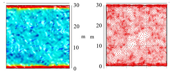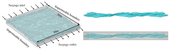 According to relevant data [23,24], the fracture face lengths in rock were mostly randomly distributed, the fracture face undulations were mostly normally distributed, and the fracture widths usually satisfied normal and negative exponential distributions. Three mean values of widths were taken here, namely, 1, 1.5, and 2 mm. After generating random functions using MATLAB, they were imported into COMSOL to establish a 30 m × 30 m fracture model, as shown in Figure 14. To obtain the seepage law of fractures under different specimen sizes, the model sizes were divided into 30 groups with side lengths of 1–30 m. To study the seepage law under the influence of different fracture roughness levels, the rough undulating structural surface morphology with JRC of 0–20 was determined by the JRC modified straight edge method [25] based on the 10 standard contour curves characterizing the JRC proposed by Barton et al. [26,27,28]. The roughness coefficients were selected as fracture roughness coefficients by substituting the distribution pattern of JRC values obtained from multiple sets of random fractures, and 5.5, 10.5, and 15.5 were selected accordingly. Some physical properties of the coal or rock were used as seepage-matrix-related parameters for this simulation. The fracture numerical simulation parameters are listed in Table 3.