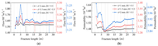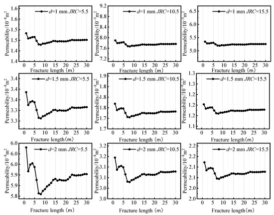 Further analysis of the results shows that, for example, when the fracture width is 2 mm, the permeability remains same after the fracture length reaches 23 m and 14 m during an increase in the fracture roughness from 5.5 to 15.5. It can be seen that the smaller the fracture roughness, the more obvious the change in fracture permeability, all other conditions being equal. In different cases, when the fracture length changes, the seepage characteristics also change, and when the fracture length reaches a certain value, the seepage characteristics tend to stabilize. When the fracture roughness is small, the critical seepage size is larger. As the fracture roughness increases, the critical size of the fracture seepage gradually decreases and converges to a certain value. This is because when the fracture roughness is small, the resistance to fluid flow within the fracture is small, and less energy is dissipated by the fluid to overcome the resistance to seepage; thus, there is a significant change in fracture permeability. When the fracture roughness is larger, the resistance of the fluid inside the fracture is higher, and, under the same seepage pressure, more energy is dissipated in the seepage to overcome the resistance; thus, the change in seepage characteristics is not obvious.