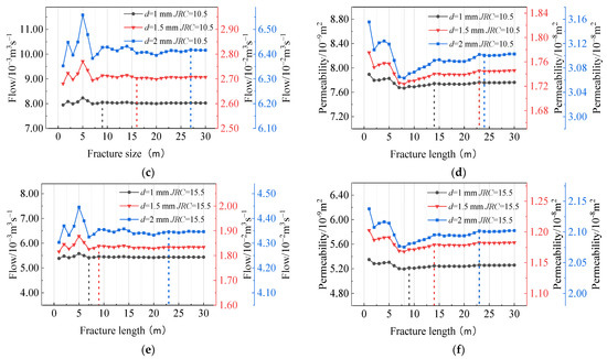 The curve variation pattern in Figure 17 also reveals that, for example, the permeability basically stops changing after the fracture length reaches 14 m and 29 m, respectively, during the increase in the fracture width from 1 mm to 2 mm at a fracture roughness of 5.5. Under different circumstances, when the fracture length changes, the seepage characteristics also change, thus reflecting the existence of the size effect of fracture seepage. When the fracture length reaches a certain value, the seepage characteristics remain unchanged, and the fracture size can be called the critical size under seepage conditions. When the fracture width is small, the internal connectivity of the fracture makes it easier for seepage to achieve stability in seepage in the small-size model; when the fracture width is increased, the internal connectivity of the fracture changes and a larger fracture size is required to achieve stable seepage, so this critical size increases.