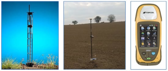 The Topcon GRS-1 handheld satellite navigation device was used to determine the boundaries of the plot (RTK accuracy, corrected signal: SKPOS cm, Figure 2b, Topcon, Livermore, CA 94550, USA, Figure 3) []. The measured section was oriented approx. 40 m from the road along the contour of the soil horizon. The values were recorded every 30 s for measurement method one and every 60 s for method two (30 values were recorded). A more detailed description of the equipment and methodology for the determination of unsaturated and saturated hydraulic conductivity is given in the following text.