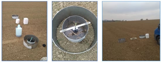 Pull-out hooks are also available for the double ring infiltrometer set. The inner rings are fitted with a synthetic measuring bridge with a measuring rod and float. The rod easily moves up and down through a small tube in the measuring bridge. The float is oriented in the middle of the rings and, together with the rod, indicates the water level. Infiltration measurements are used in the field, where this device is used to determine the saturated hydraulic conductivity of the soil ks. The method is based on inserting the inner ring into the outer ring of the prescribed diameter. The placement depth also depends on the compacted soil surface layer. After fitting the rings, the principle is flooding them with water and then monitoring the drop in the water level in the inner circle over time. The process is repeated until the soil is saturated, i.e., the quasi-steady infiltration rate is the same for two consecutive tests. The degree of infiltration results from the inner diameter of the circle, a certain drop in level, and the time recorded for each step. Filling one set requires up to 25 L of water (we applied 10 L of blue rock concentrate), and the circles should be filled to 5 to 10 cm. To obtain optimal infiltration results, it is advisable to use water of similar quality and temperature as in the measured environment. The sequence of the depreciation of values for the determination of saturated hydraulic conductivity and infiltration rate was 60 s. Vertical infiltration was calculated according to the relationship (based on Philip’s known infiltration equations) []: