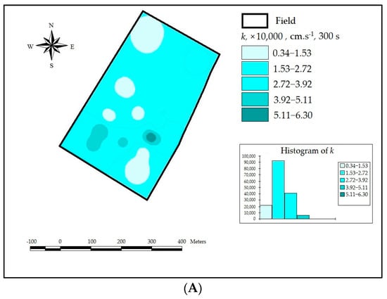 Spatial variability of hydraulic conductivity, (A) measurements of 300 s cycle, (B) measurements of 900 s cycle.