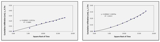 Dependence of cumulative infiltration on the square root of time (x1, 0.7 m and 2.7 m, 300 s) determined with method one.