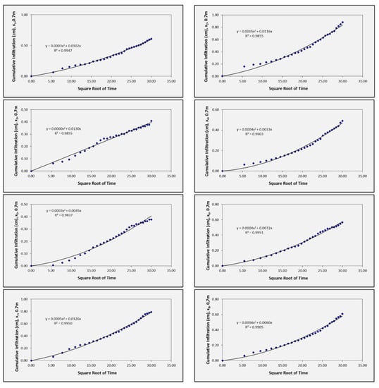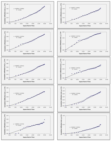 Figure 7 presents the results of cumulative infiltration as a function of the square root of time in the uncompacted locality of interest (−2.7 m from the auxiliary line, Figure 2). Hydraulic conductivity reached a variability of 78.71% with an average value of 0.98 cm·s−1 (measurement time interval was 900 s). For the uncompacted line, the variability was from −1.07 × 10−4 to 2.14 × 10−4 cm·s−1, where we had two cases with negative values (x4 and x6, C1 < 0.000) and two cases with a zero value (x2 and x9, C1 = 0.0000). The graphical representation of the results (Figure 7) clearly demonstrates that the infiltration of water into the soil expressed by hydraulic conductivity is a complex phenomenon, and at some monitoring points, there were jumps and not smooth changes (x3, x4, x6, and x9).
