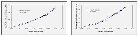 Figure 6 shows the dependence of cumulative infiltration on the square root of time in the time interval of measurement 300 s (x1, 0.7 m—compacted soil with a seed drill, 2.7 m—uncompacted). The first case is an almost continuous change of cumulative infiltration with the slope parameter of curve C1 determined according to the methodology. After determining these results, the hydraulic conductivity (k) was determined. However, after increasing the number of measurements to 30 (900 s), the curve changed slightly (Figure 6, x1, the value of the coefficient reached 0.0003, the parameter R2 changed from 0.989 to 0.995).