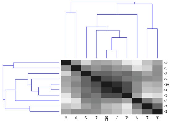 The map of distances of the mini disk infiltrometer measurement results (Figure 8) present the largest (faintest) and smallest distances between places in colour (dark to zero, the same value black). The results show the variability of hydraulic conductivity and the effect of compaction created by the tracks of the tractor wheels (compressed three bands, Figure 2 on the right) and the effect of the passage of machinery along the line. When using the ANOVA statistical tests with one-factor analysis, all ten monitoring points were included in the study of the influence of the time interval of soil infiltration monitoring; in the case of not only the compacted soil layer by the seed drill (Fcrit > F = 2.61, p = 0.123) but also the uncompacted soil (Fcrit ≥ F = 0.00015, p = 0.99), there was no statistically significant difference. If monitoring points x3 and x5 were not considered with the seed drill compacted soil, the results were already statistically significant (p = 0.002, F > Fcrit). In the case of uncompacted soil, a situation arose where the outer monitoring points showed a decrease in infiltration and the central monitoring points increased. From these data, the result of statistical insignificance remains. Again, considering all ten points (x1 to x10) when evaluating the statistical dependence on compacted soil by seed drill, the significance hypothesis was not confirmed (Fcrit > F = 2.64, p = 0.12, at level 0.05). The results were not statistically significant when monitoring the dependence of soil infiltration capacity variability from the monitoring point (position on the plot x1 to x10) (p = 0.69).