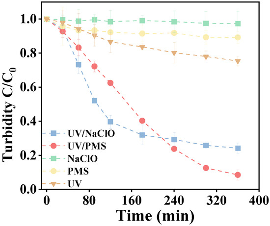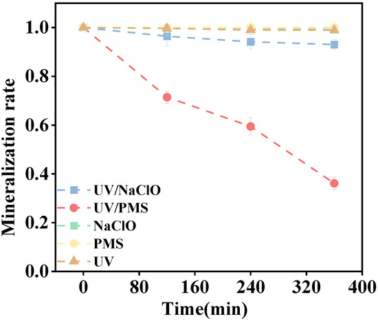 - The UV/NaClO and UV/PMS systems achieved 78.20% and 94.30% turbidity removal in 360 min of reaction time. However, the corresponding mineralization rates were 7.00% and 63.90%, indicating that UV/NaClO could not completely mineralize nanoplastics into inorganic substances, but only decompose it into smaller organic molecules.