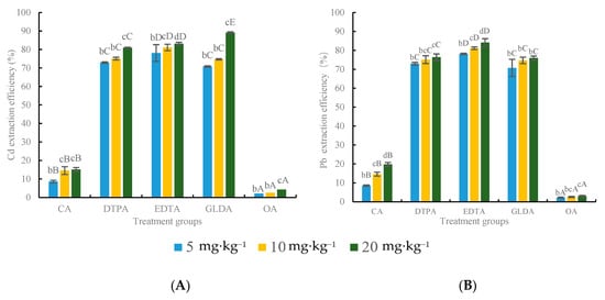 The extraction efficiencies of different chelating agents, including EDTA, GLDA, DTPA, OA, and CA on Cd in the study soil are shown in Figure 1A, and Pb in Figure 1B.