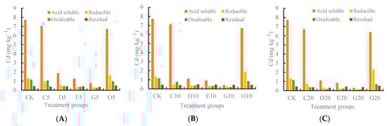 Figure 2 is the Changes in speciation of heavy metal Cd in the soil after leaching with different concentration of chelating agents, 5 mmol·kg−1 (Figure 2A), 10 mmol·kg−1 (Figure 2B), and 20 mmol·kg−1 (Figure 2C). It can be seen that under the three concentrations of chelating agents, the concentration changes of various forms of Cd are not significant, indicating that the concentration of chelating agents has no significant impact on the extraction efficiency of different forms of Cd in soil.