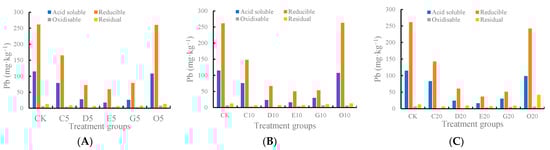 Changes in speciation of Pb in the soil after leaching with chelating agents. Note: (A) Changes in speciation of Pb in the soil after leaching when the concentration of chelating agent is 5 mmol·kg−1; (B) Changes in speciation of Pb in the soil after leaching when the concentration of chelating agent is 10 mmol·kg−1; (C) Changes in speciation of Pb in the soil after leaching when the concentration of chelating agent is 20 mmol·kg−1.
