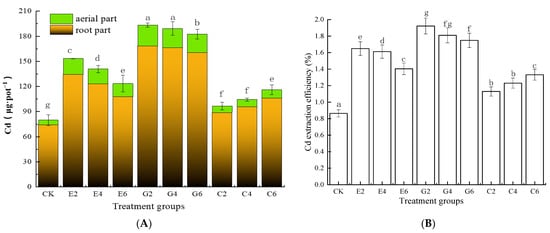 Plant growth plays a critical role in the phytoextraction of heavy metals from the contaminated soil. The addition of chelating agents could increase the root biomass. Figure 4A illustrates that EDTA, GLDA, and CA significantly increased the uptake of Cd in both the aerial and root parts of ryegrass compared to the control group (CK). As the concentration of EDTA and GLDA increased, the amount of Cd extracted from the aerial fraction continued to decrease. At 2 mmol·kg−1, the extraction amount of Cd in the aerial part was relatively high, reaching 19.18 μg Cd·pot−1, and 24.79 μg Cd·pot−1, respectively, which were 2.33 and 3.30 times higher than the CK. However, the results obtained from CA and the EDTA/GLDA mixture were different. As the concentration of CA increased, the amount of Cd extracted from the aerial parts increased, reaching a maximum of 10.11 μg Cd·pot−1 when the concentration of CA was 6 mmol·kg−1, which was 0.76 times higher than the CK. This is because high concentrations of EDTA and GLDA have a toxic effect on plants and inhibit their growth and development, while CA is less toxic and can promote plant growth.