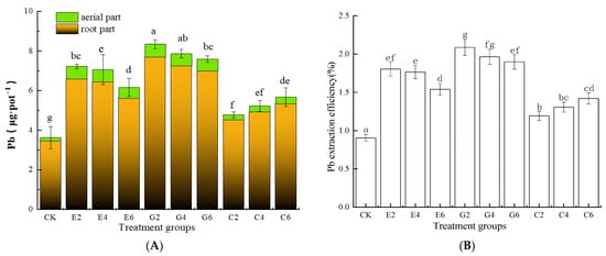 The results presented in Figure 5A indicated that EDTA, GLDA, and CA significantly increased the uptake of Pb in both the aerial and root parts of ryegrass compared to the CK. As the concentrations of EDTA and GLDA increased, the aerial extraction of Pb from ryegrass gradually decreased. The maximum extraction of Pb from the soil by the aerial portion with 2 mmol·kg−1 of EDTA was 0.62 mmol·kg−1, which was 2.88 times higher than the CK. The maximum extraction of Pb by the aerial parts of ryegrass was 650 mg Pb·pot−1 with 2 mmol·kg−1 of GLDA, which was 3.06 times higher than the CK. The extraction of Pb increased continuously with increasing CA concentrations. The maximum extraction of Pb was 0.35 mg Pb·pot−1 with 6 mmol·kg−1 of CA, which was 1.18 times higher than the CK.