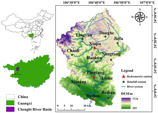 The Chengbi River basin has been selected as the study area for the following reasons. Firstly, it is of strategic significance to the local water supply, power generation, agricultural irrigation and even the construction of the China–ASEAN-featured tourism belt. Secondly, the Chengbi River basin is a typical karst area with unique hydrogeological background. Its aquifer is highly permeable, resulting in more frequent transformations between surface water and groundwater than in other areas. The special karst landscape of the basin makes its hydrological cycle vulnerable to the influence of climate change, which causes it to become a frequent place of drought and flood disasters [20].