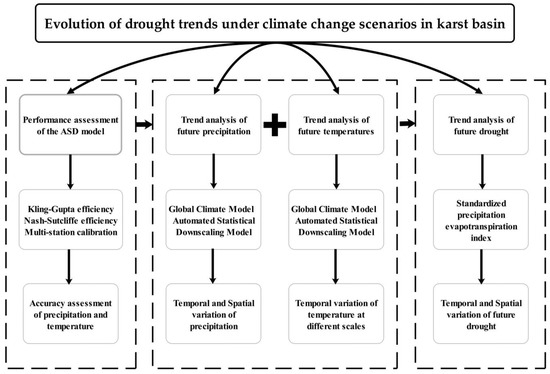 Nine percent of the global population partly or fully relies on karst water resources, making the drought assessment in karst areas of significant engineering and scientific importance [30]. However, karst geo-climatic features are highly spatially heterogeneous, making reliable drought assessment challenging. The successive proposals of climate change scenario data, statistical downscaling models, and drought indexes have provided new opportunities to enhance the reliability of drought assessment in karst areas but these have only been partially explored. This study helps to bridge this gap by combing the multi-station calibration-based automated statistical downscaling (ASD) model and Standardized Precipitation Evapotranspiration Index (SPEI) to conduct drought assessment in karst basins under a Shared Socio-Economic Pathway (SSP).