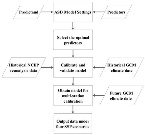 The construction of the ASD model is shown in Figure 3. The main steps of the downscaling process based on the ASD model are as follows. Firstly, the characteristics of the NCEP and GCM models are combined to optimize the 15 predictors that best characterize the predictand, as shown in Table 2. Because each station is located at a different altitude, the influence of atmospheric circulation on climate is variable. Therefore, the predictors are different for each station. Details are shown in Table 3. Secondly, the historical NCEP and GCM data (calibration period: 1963–1998, validation period: 1999–2014) are brought into the constructed statistical function relationship to calibrate and validate the ASD model. Third, the future GCM data (2023–2100) are input into the multi-station calibrated ASD model to obtain future climate data under different SSP scenarios.