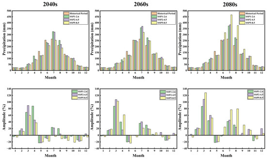 Figure 4 reflects how the precipitation changes in different periods. The data for the historical period comprise the observations of the Chengbi River basin. Regardless of the period, the monthly average precipitation varies significantly under all three scenarios. Precipitation is mainly concentrated from June to August, while the overall distribution shows a high middle and low end with an “asymmetric single peak”, which indicates an extremely uneven interannual distribution of precipitation. Meanwhile, the precipitation increases in most months with a growing trend from the 2040s to the 2080s. In the 2040s, precipitation under the three scenarios shows an increasing trend in February to April and July to August with a range of 4.2% to 89.7%. In the 2060s, precipitation rises mainly in February to April, July, and August to September with a range of 0.9% to 107.7%. In the 2080s, precipitation trends increased in all months except January, May, and November, with variations ranging from 0.4% to 128.2%. Precipitation is increased by over 50%, mainly in March and April. For March, when the increase is most significant, the variability of precipitation for the three periods under the SSP1-2.6 scenario is 69.1%, 86.9%, and 87.0%, respectively. Under the SSP2-4.5 scenario, the variability of precipitation for the three periods is 89.7%, 107.7% and 108.4%, respectively. Under the SS5-8.5 scenario, the variability of precipitation for the three periods is 60.3%, 102.9%, and 128.2%, respectively. However, it is particularly important to notice that the monthly average precipitation in the coming decades may occur insufficiently in May, June and November compared with the historical period. This phenomenon is particularly reflected under all three scenarios. In summary, precipitation primarily tends to increase in the three future periods.