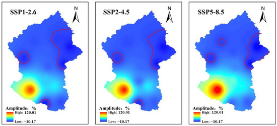 The results in spatial interpolation are generally influenced more by the nearer stations and less by the distant stations. The inverse distance weighting (IDW) method is used to interpolate the spatial distribution of future multi-year average precipitation variability compared with the historical period in the Chengbi River basin under the three scenarios. The interpolation results are shown in Figure 5. The red line in the figure is the zero lines dividing the increasing or decreasing regions. The spatial distribution of precipitation variability is very different. The spatial variation of precipitation under the SSP1-2.6, SSP2-4.5 and SSP5-8.5 scenarios ranges from −8.45% to 112.37%, −9.32% to 118.75% and −10.17% to 120.01%, respectively. Therefore, the maximum and minimum variations of precipitation occur under the SSP5-8.5 scenario. Under all three climate change scenarios, precipitation increases over most of the basin, while the largest increasing trends are concentrated in the southwest region downstream. This may be due to the greater vegetation cover in the southwestern part of the basin, which provides a large amount of water vapor to the atmosphere and increases air humidity. Meanwhile, because of the higher terrain to the north of the Xiajia station forming the windward slope, the topographic lifting effect intensifies the upward movement of water vapor, which leads to more precipitation. The largest decreasing trends are concentrated in the eastern and western parts of the upstream region, and the region of basins with negative variability is gradually decreasing. In general, precipitation primarily demonstrates different degrees of increase under all future scenarios.