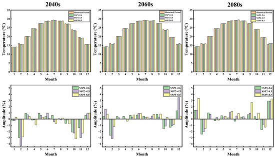 Figure 6 displays the variation of the monthly average temperature in the Chengbi River basin. The data for the historical period is composed of the observations of the Chengbi River basin. The monthly average temperatures under the three scenarios mainly show an increasing trend, but the changes are not very significant compared with the historical period. Meanwhile, the temperature increases in most months from the 2040s to the 2080s. In the 2040s, the temperature mainly shows increases in March, May, June, August and December under the three scenarios, with variations ranging from 0.07% to 0.95%; while the temperature is on the decline in the other months, especially in February, October and November. In the 2060s, the temperature in the other months mainly shows an increase except for February, October and November, with variations ranging from 0.04% to 3.47%. In the 2080s, the temperature in the other months mainly shows an increase, except for February, April, and November, with variations ranging from 0.007% to 3.34%. An over 50% increase in temperature occurs mainly in December of the 2080s. For December, the temperature variation under the three scenarios is 2.9%, 2.8%, and 3.3%, respectively. In addition, the variation of temperature in the 2080s is slightly higher than in the other two periods. However, it is particularly important to note that the monthly average temperature may be lower during the future months of February, October and November compared with the historical period. This phenomenon is reflected under all three scenarios. In general, the temperature in the future three periods compared with the historical period mainly shows an increasing trend.