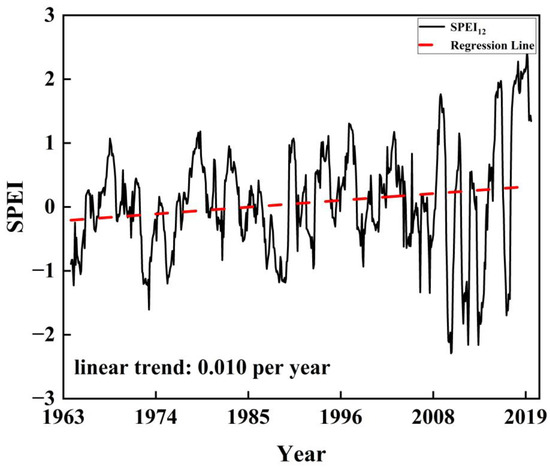 Different from SPI, the SPEI considers the influence of both precipitation and temperature on drought. Monthly precipitation minus monthly potential evaporation is used to replace monthly precipitation in the SPI calculation. The SPEI on different time scales can reflect drought conditions under different stages. The 3-month SPEI, for example, can reflect the seasonal wet and dry conditions, which can then be used for the analysis of agricultural drought conditions, while the 6-month SPEI can reflect the semi-annual climatic drought conditions, and the 12-month SPEI can reflect the overall annual drought conditions and the influence of climate change on the water resources of the basin. Therefore, the 12-month SPEI is chosen to systematically analyze the drought conditions in the Chengbi River basin. The specific calculation process is divided into four steps [29]: