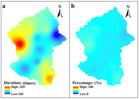 The drought duration is defined by the sum of consecutive drought months (characterized by SPEI12 < −0.5) for all of the drought events. The percentage of drought duration is equal to the drought duration divided by the total number of months in the period. The range of percentages is 0 to 100%. The larger the percentage, the longer the duration of the drought suffered in the basin during this period. As with precipitation, the IDW method is used to interpolate the spatial distribution of the drought duration and the percentage of drought duration for the historical period. The interpolation results are shown in Figure 9. The redder the color in the figure, the greater the percentage of drought duration, and conversely the bluer the color, the smaller the percentage. It can be seen from Figure 9a that the drought duration in the northwest of the basin is longer than those in other regions. The percentage of drought duration does not differ significantly among the stations in the basin. The drought duration percentage of all stations exceeds 27%, among which the drought duration percentage of Bashou station is the largest (39%). This indicates that the Chengbi River basin experienced drought for about 30% of the historical period.