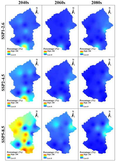 Figure 10 is the spatial distribution of the percentage of drought duration for each period in the Chengbi River basin obtained by using the IDW method under the three scenarios. Under the SSP1-2.6 scenario, the range of variation in the percentage of drought duration is 0 to 67%, 0 to 28% and 0 to 31% for the 2040s, 2060s and 2080s, respectively. Under the SSP2-4.5 scenario, the range of variation in the percentage of drought duration for the three periods is 0 to 81%, 0 to 31% and 0 to 19%, respectively. Under the SSP5-8.5 scenario, the range of variation in the percentage of drought duration is 0 to 97%, 0 to 42% and 0 to 41%. The variation in the percentage of drought duration in the 2040s is more obvious than in the other two periods, which indicates that drought may occur for a longer period in the 2040s. A much smaller percentage of drought duration is found in most regions in the 2060s and 2080s. Meanwhile, the northeast region of the basin is more prone to drought in the 2060s and 2080s. The percentage of drought duration gradually decreases in most areas of the basin from the 2040s to 2080s under the three scenarios, indicating that future drought conditions are alleviated. For the SSP5-8.5 scenario, precipitation and temperature are less in the 2040s period than in the historical period. Insufficient precipitation can easily lead to the occurrence of drought. The southern region of the basin is densely vegetated, and when precipitation is low, the vegetation absorbs a lot of water, which may cause drought. The upstream area is a typical karst region, where the aquifers are highly permeable and have a weak water storage capacity. At the same time, the increased temperature exacerbates transpiration, resulting in more water loss, which may lead to the occurrence of a small-scale drought. From the SSP1 scenario to the SSP5 scenario, the concentration of CO2 increases continuously. The percentage of drought duration increases with increasing CO2 concentration in most of the regions for the three periods. In general, future drought conditions are alleviated compared with the historical period. However, the drought condition is still more severe under the SSP5-8.5 scenario in the 2040s, so more attention should be paid to drought control in 2040s.