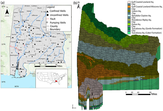 The study site: East Gulf Coastal Plain (EGCP), Alabama, (a) regional map illustrates the location of 41 observation wells, 74 pumping wells, main rivers, and faults used in this study. (b) The three-dimensional geologic model for EGCP. The name of each aquifer is listed in the legend.