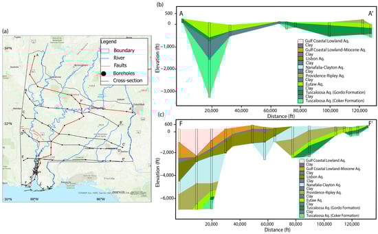 Example of cross-sections derived from 48 boreholes (a). Cross-section A-A′ (b), and cross-section F′-F (c). Note that the stratigraphic columns using lithologic correlation (with also uniformities) shown in (b,c) end at the bottom of each borehole, which does not mean that the aquifer terminates abruptly (GMS matches the rock types below boreholes, which are not shown here since the plots (b,c) only illustrate the cross-sections derived by boreholes).
