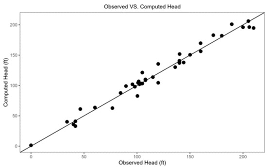 Groundwater heads for all 41 monitoring wells (in either unconfined or confined aquifers) observed in November 2020 were fitted by the steady-state flow model. Three parameters—hydraulic conductivity, recharge rates, and riverbed conductance—were selected as calibration parameters, since there were no measurements in this area for these parameters, and they may significantly affect groundwater head distributions. To achieve the best calibration, we combined a trial-and-error approach (for a preliminary calibration) and then automated parameter estimation using Pilot PEST. The simulated groundwater heads are similar to the measured ones (Figure 3), where the root mean square error (RMSE) for all 41 monitoring wells is 9.38 ft. The model error is unbiased and is relatively low compared to the overall range of the observed groundwater heads (~200 ft).