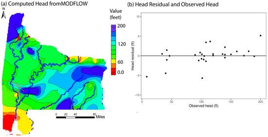 (a) The simulated groundwater table contour map (in November 2020) using MODFLOW, and (b) a graph showing the observed head and the residual for each computed head.