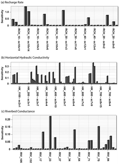 PEST calibrates 158 model parameters (in three types, as mentioned above) that may affect groundwater flow magnitude and/or direction (Figure 5). The PEST simulation also provides the parameter sensitivity calculation. Sensitivity analyses showed that the recharge rate is the most sensitive parameter, followed by horizontal hydraulic conductivity and riverbed conductance, respectively (Figure 5). PEST keeps track of each parameter’s composite and relative composite sensitivity. At the end of parameter calibration, PEST performs sensitivity analysis [62]. To calculate parameter sensitivity, Hill and Tiedeman [63] utilized the following equation to obtain the (dimensionless) composite scaled sensitivity (CSS) of parameter i: