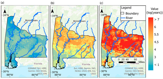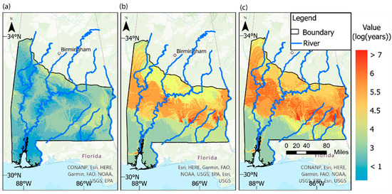 Most groundwater above 300 ft (depth below the groundwater table) in southern Alabama is younger than 100 years (Figure 7a), which is Anthropocene-age and therefore, susceptible to surface contamination [69]. Most deep aquifers (≥700 ft below the groundwater table in southern Alabama contain groundwater older than 20,000 years, representing “fossil” aquifers in the Pleistocene epoch and should be “safe” from modern contamination [70]. The existence of both modern and “fossil” aquifers in southern Alabama is generally consistent with the reported isotopic ages of groundwater. For example, the estimated mean groundwater age by Solder [64] using 14C for the South Atlantic and Gulf Coast is ~30,000 years, indicating “old” groundwater in the aquifer system (i.e., “fossil” water). Relatively young groundwater with a mean age of less than 2000 years was typically found in some unconfined parts of these aquifer systems [64]. In this study area (i.e., along the Southeastern Coastal Plain and the Coastal Lowlands), there were a total of 24 samples analyzed for 14C with ages ranging from less than 100 years to more than 80,000 years (Figure 6b). The results indicate that the age of groundwater in the study area varies in an aquifer with sampling depth. Particularly, we found that the shallow wells located in the uppermost layer (i.e., Layer 1) tend to contain younger groundwater compared to deep wells (located in deeper layers).
