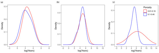 To further interpret the groundwater age distribution, the particle tracking ages calculated in Section 3 were transformed into probability density functions (PDFs). The physical heterogeneity of regional-scale aquifers is usually characterized by highly variable flow velocities and multiscale coherence lengths [71]. Here the groundwater age is defined as the amount of time since the water parcel entered the aquifer (i.e., ignoring the delay of the vadose zone). Figure 10 and Figure 11 plot the PDF distributions of groundwater ages employing two parameters, effective porosity and vertical hydraulic conductivity .