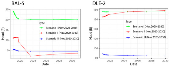 Scenario I: Base case following historical recharge and pumping rates. Harper et al. [36] found that the total groundwater withdrawal in Alabama was 496 million gallons per day (MGD) in 2015, more than half of which was used for public consumption. Scenario I assumed that the groundwater recharge and withdrawal rates would remain constant for the next decade, and there would be 78 pumping wells (the same number of wells identified for the steady-state model) with a pumping rate of 0.85 Mft3/day/well. The corresponding evolution of the groundwater head was modeled until 2030. Results showed that the distance of the wells from the boundary condition (i.e., the constant head boundary) had a significant impact on the effect of pumping rates on the groundwater system. On the one hand, wells located far from the boundary in Layer 1 exhibited a mixed pattern of drawdown fluctuation, where the pumping rate dominates the recharge rate, leading to a decline in groundwater levels over time. On the other hand, wells located closer to the boundary and wells in Layer 2 were not significantly affected by the change in pumping rates (Figure 13), as expected.