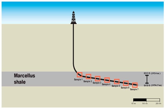 The Marcellus shale formation, located in the northeastern Appalachian Mountains, is of the Middle Devonian age. A stratigraphic study indicates that the Marcellus shale underwent a transition from a stable shallow marine system to a foreland basin [5]. The Marcellus formation, which is dark grey to black in color, contains minerals such as pyrite, dolomite, calcite, and marcasite, and has an estimated thickness of 541 ft (165 m) [6,7]. Horizontal drilling and hydraulic fracturing technologies have been successfully deployed in Marcellus shale plays.
