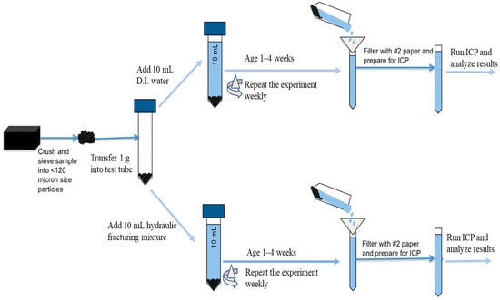 Leaching tests were performed to assess the solubility of clay minerals. The leaching concept is illustrated in Figure 2. Leaching tests are used to assess the potential release of pollutants from solid materials, such as shales, when exposed to variable conditions. During the test, a sample of the shale is placed in contact with a liquid, such as water, and the resulting solution is analyzed for the presence of contaminants. The presence and concentration of contaminants in the liquid indicate that a leaching test has occurred. The test results can then be compared to regulatory standards or other criteria to determine the potential environmental impact of the effluents’ content.