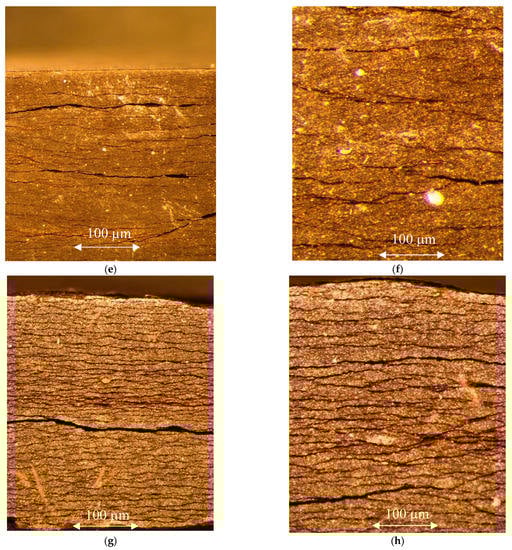 Optical images of Marcellus shale samples (a–d) from an outcrop and (e–h) from drilled cores at depths 6334.5 ft, and 6419.55 ft. Outcrop images show compositional heterogeneity, layered structure, and fractures. Drilled core 2 (6334.5 ft) shows limited networking and connections of non-uniform fractures along bedding planes, with some larger fracture aperture present. Drilled core 7 (6419.55 ft) shows extensive fractures along bedding planes. (a) Optical (low magnification, 2×) Marcellus shale outcrop sample, shows compositional heterogeneity, layered structure, and fractures. (b) Optical image (higher magnification, 7×) Marcellus shale outcrop sample reveals fractures/microfractures parallel to layering and different grain sizes within alternate layers. (c) Optical image of Marcellus shale outcrop sample. (d) Optical image of Marcellus shale outcrop sample. (e) Optical image of Marcellus shale drilled core sample 2 (6334.5 ft) (low magnification, 2×) shows non-uniform fractures along bedding planes with some larger fracture aperture present. (f) Optical image of Marcellus shale drilled core sample 2 (6334.5 ft) (high magnification, 7×) shows limited networking and connections of non-uniform fractures along bedding planes [13]. (g) Optical image of Marcellus shale drilled core sample 7 (6419.55 ft) (low magnification, 2×) shows extensive fractures along bedding planes. (h) Optical image of Marcellus shale drilled core sample 7 (6419.55 ft) (high magnification, 7×) shows networking and connections of extensive fractures along bedding planes.