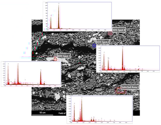 Figure 4 and Figure 5 depict the optical and SEM images of the outcrop and core samples from the zone of interest. The lighter and darker areas in the SEM image (Figure 4b) highlight the differences in the shale’s bulk material. These areas were examined at higher magnification as described in Figure 4d,f,h.