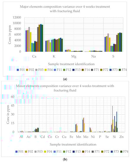 Average ICP results for treatment with fracturing fluid (~1500 to 9000 ppm). (a) Shows the most abundant samples (~0 to 60 ppm). (b) Shows the less-abundant samples. Fxy (F: fracturing fluid, x: sample ID, y: a period of treatment in weeks); 0: outcrop, 1: core sample 1, 7: core sample.