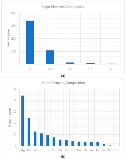 Relative abundance of the chemical elements detected through ICP. (a) The concentrations of major chemical elements measured (5 to 400 ppm). (b) Shows the concentrations of minor chemical elements measured (0 to 0.45 ppm).