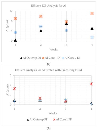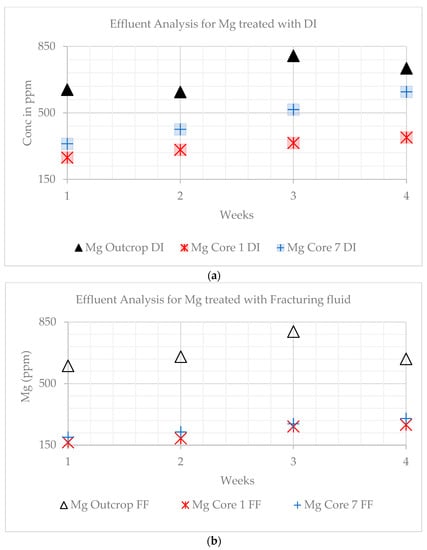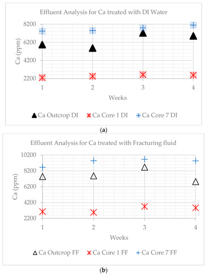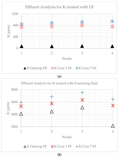 Dissolved sodium is relatively constant and lowest for the outcrop, but a net increase is observed for the core samples treated with DI water. The concentrations were higher for core sample 1. When treated with fracturing fluid, the general trend was a positive slope (Figure 11a,b). A sharp increase was observed for the outcrop at week 4. The Na concentration decreased over time for the outcrop, from 34.32 to 24.84 ppm. The values increased from 231.59 to 269.18 ppm for core sample 7 DI water-treated samples and from 224 to 242.99 ppm when treated with the fracturing fluid. When samples were DI water-treated, values for core sample 1 decreased from 343.26 to 340.08 ppm and increased from 316.97 to 330.77 ppm when treated with the fracturing fluid.