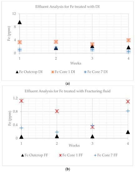 Fe2+ was another element that was consistently leached out. Values of Fe decreased when the outcrop and core 7 were treated with DI water. The range was 9.45 to 3.95 ppm for the outcrop and 1.05 to 0.51 ppm for core sample 7 (Figure 14a,b). Fe values slightly increased in core 1, ranging from 3.33 to 3.95 ppm. These values decreased when treated with fracturing fluid for core 1, from 1.12 to 1.10 ppm, and considerably increased for the outcrop (0.04 to 0.18 ppm) and core 7 (0.31 to 0.82 ppm).