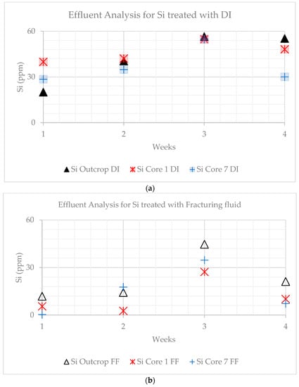 Effluent concentration variations in Si with time. (a) Shows the variation in concentration for samples treated with DI water. (b) Shows variation in concentration when treated with FF. The highest values for Si are in the outcrop for DI water and fracturing fluid treatments.