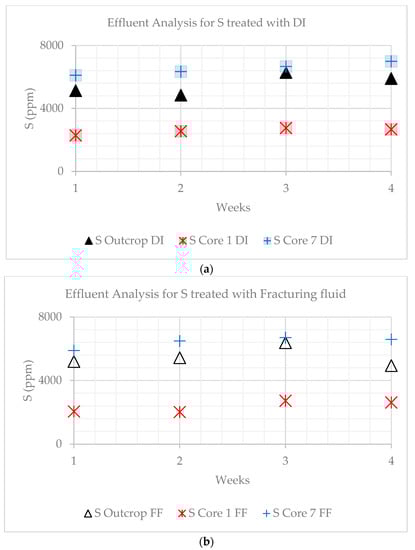 Effluent concentration variations in S with time. (a) Shows the variation in concentration for samples treated with DI water. (b) Shows variation in concentration when treated with FF. The highest values for S are recorded in core 7 when DI water-treated and the lowest when treated with fracturing fluid.