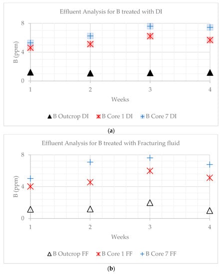 Boron was found in all samples and the levels remained constant in the outcrop but increased for cores 1 and 7 when treated with both fluids (Figure 18a,b). The values for B in DI water-treated effluents for the outcrop ranged from 1.20 to 1.17, from 4.62 to 5.68 ppm for core 1, and 5.29 to 7.44 ppm for core sample 7. The values for B in fracturing fluid-treated effluents for the outcrop decreased from 1.16 to 0.99 ppm, increased from 4.02 to 5.12 ppm for core sample 1, and from 5.02 to 6.78 ppm for core sample 7.