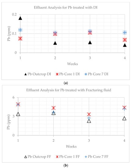 Lead is a heavy metal used to protect from radioactive effects. However, improper exposure to lead can pose adverse health risks. Lead content decreased for all samples when treated with DI water, as described in Figure 19a,b. The same was observed for the fracturing fluid treatments. The lowest values were observed for the outcrop and the highest for core 7. The values for Pb in DI water-treated effluents for the outcrop ranged from 0.18 to 0.04 ppm, 0.07 ppm on average for core sample 1, and 0.1 ppm on average for core sample 7. The values for Pb in fracturing fluid-treated effluents for the outcrop decreased from 3.38 to 2.70 ppm, from 4.88 to 4.19 ppm for core sample 1, and from 4.92 to 4.40 ppm for core sample 7.