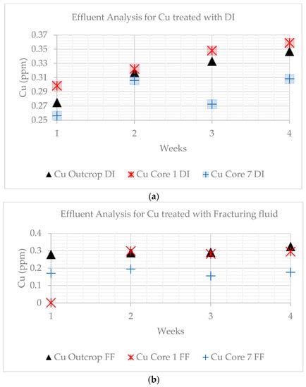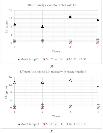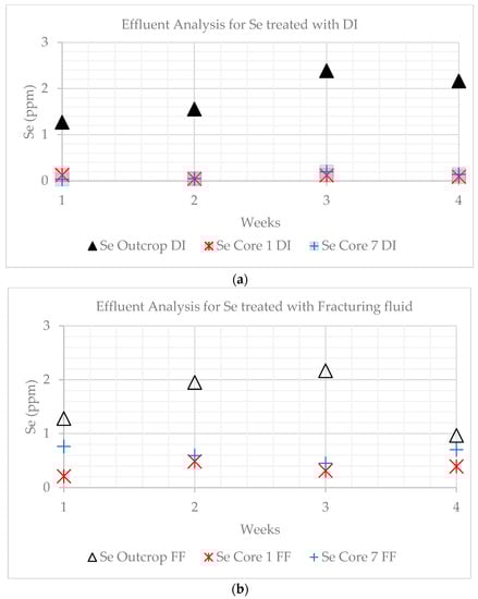 Molybdenum showed a decrease in both DI water-treated and fracturing fluid-treated effluents for the outcrop and core samples. Molybdenum can occur in shale formations as a component of sulfides such as molybdenite. The dissolution of Mo could lead to the formation of amorphous hydrous silica and alumina, which could potentially clog pores within the matrix and fractures, leading to a reduction in permeability [40]. The safe limit for Mo in drinking water is 0.07 ppm, which is exceeded in all samples except for the fracturing fluid-treated effluent for core sample 7 (average DI water: 6.69 ppm, FF: 7.12 ppm) [36,40].