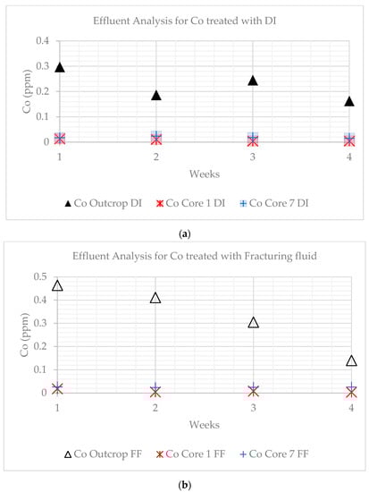 Cobalt showed a decrease in both DI water-treated and fracturing fluid-treated effluents for the outcrop and core samples. Cobalt can occur in shale formations as a component of clay minerals such as illite and smectite. The dissolution of Co could lead to the formation of amorphous hydrous silica and alumina, which could potentially clog pores within the matrix and fractures, leading to a reduction in permeability [38]. Cobalt is not considered to be a major environmental or health concern, and there is no established safe limit for Co in drinking water [39].